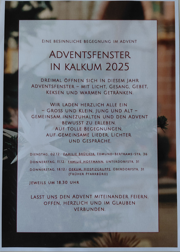 In Kalkum öffnen sich drei Mal Adventsfenster – mit Licht, Gesang, Gebet, Keksen und warmen Getränken.